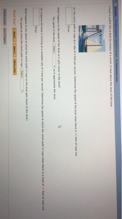When the boat is 12ft from the dock, the length of the rope from the boat to the dock is 3ft longer than twice * on this problem i am basically missing the whole concept of how to correctly set and find the material to work it out.