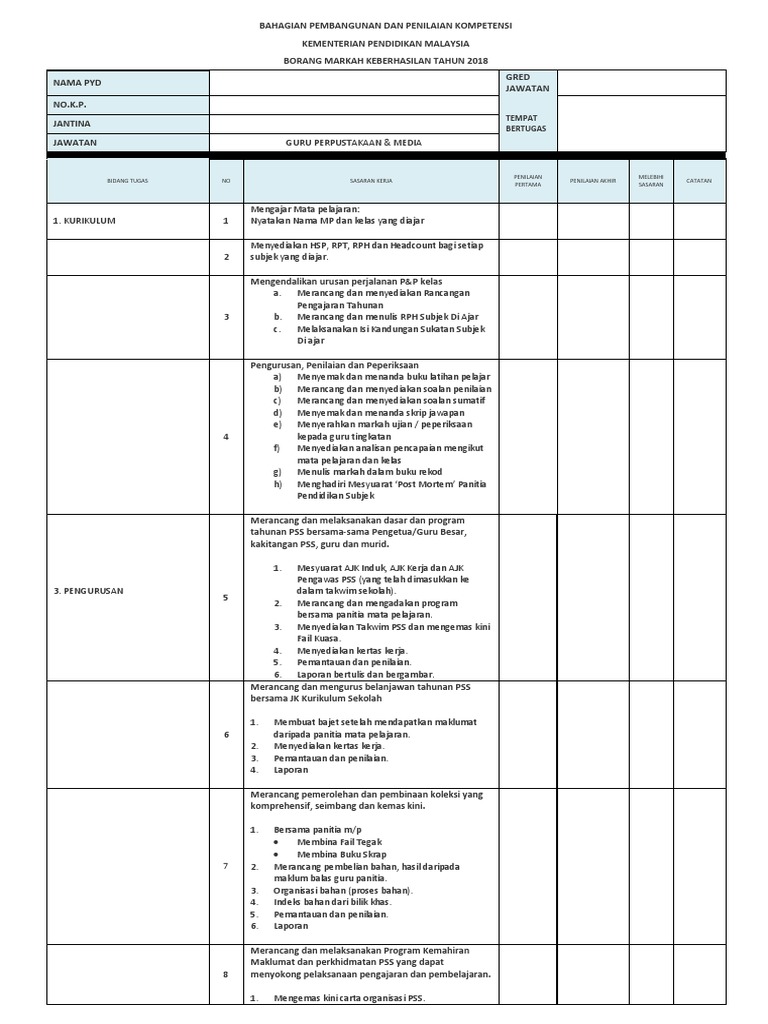 Markah penilaian hendaklah diberi pada pertengahan tahun dan dimuktamadkan pada akhir tahun dalam tahun penilaian. Asas penilaian keberhasilan berfokuskan kepada peningkatan atau pencapaian. Penilaian keberhasilan merupakan penilaian hasil kerja utama (outcome) yang memberi impak berdasarkan tugas dan tempat bertugas. Kondisi pendidikan dan materi pelajaran. Jikalau anda penjawat awam, jangan lupa untuk update sistem hrmis anda sekarang ini lagi ia telah digantikan dengan.