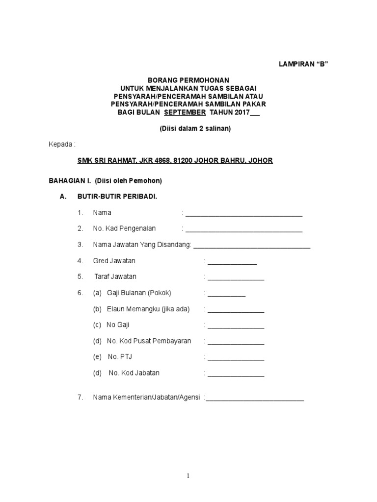 Borang Tuntutan Perpindahan Penjawat Awam from harianpost.my Kadar dan syarat tuntutan elaun, kemudahan dan bayaran kepada pegawai perkhidmatan awam kerana menjalankan tugas rasmi (tidak termasuk anggota tentera atau polis). 1.1 borang tuntutan penceramah (lampiran 'b' di wp 1.8) 1.2 surat jemputan sebagai. Untuk membuat bayaran tuntutan ganti rugi/pampasan berdasarkan perintah. Tuntutan jumlah besar (rm) 2. Borang pks (f) 1 dengan maklumat caruman perkeso dan penyata gaji. Beserta dengan borang tersebut, pemohon juga perlu mengemukakan beberapa dokumen lain iaitu Proses tuntutan etiqa yang cepat dan mudah. Lampiran b borang tuntutan penceramah.