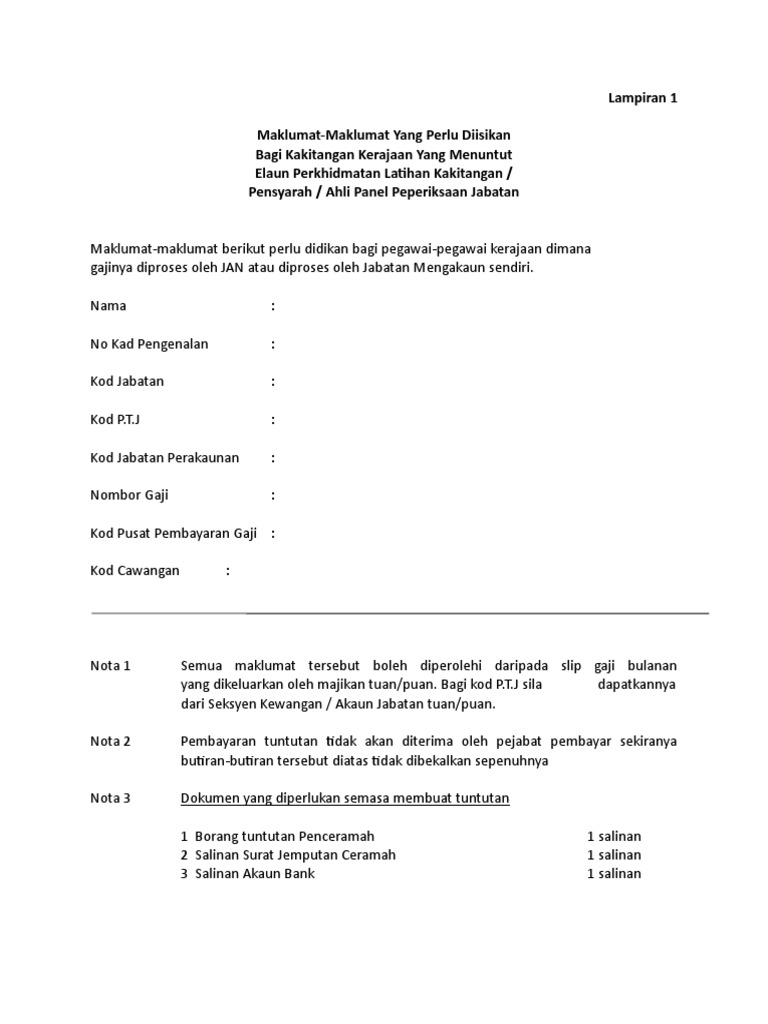 Untuk membuat bayaran tuntutan ganti rugi/pampasan berdasarkan perintah. 1.1 borang tuntutan penceramah (lampiran 'b' di wp 1.8) 1.2 surat jemputan sebagai penceramah 1.3 salinan akaun bank 1.4 salinan slip gaji semak kadar bayaran penceramah berasaskan kelayakan akademik bagi individu bukan kakitangan kerajaan (swasta dan pesara kerajaan) selaras dengan. Tuntutan pembayaran yang dikemukakan selepas tempoh tersebut tidak akan dipertimbangkan untuk bayaran. Beserta dengan borang tersebut, pemohon juga perlu mengemukakan beberapa dokumen lain iaitu Contoh surat tuntutan bayaran download kumpulan gambar.