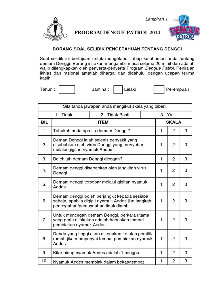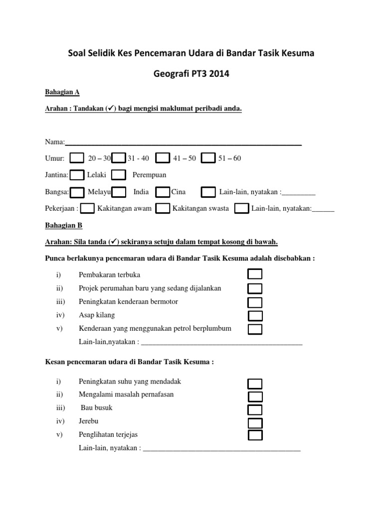 Soal selidik itu perlu dilakukan oleh calon pt3 di tingkatan 3 secara individu mahupun secara berkumpulan bagi mendapatkan maklumat serta maklum balas daripada responden (individu yang disoal selidik) di kawasan kajian berhubung dengan tugasan. Borang kaji selidik tugasan geografi tingkatan 3. Sebuah kaji selidik bukan hanya satu set soalan yang terdapat di lamanlaman web, tetapi ia adalah salah satu 'senjata' dan 'alat' yang penting di dunia perniagaan, komuniti, akademik, dan pelbagai bidang lain. Text of contoh soal selidik kpm. Related posts to contoh soalan soal selidik obesiti.