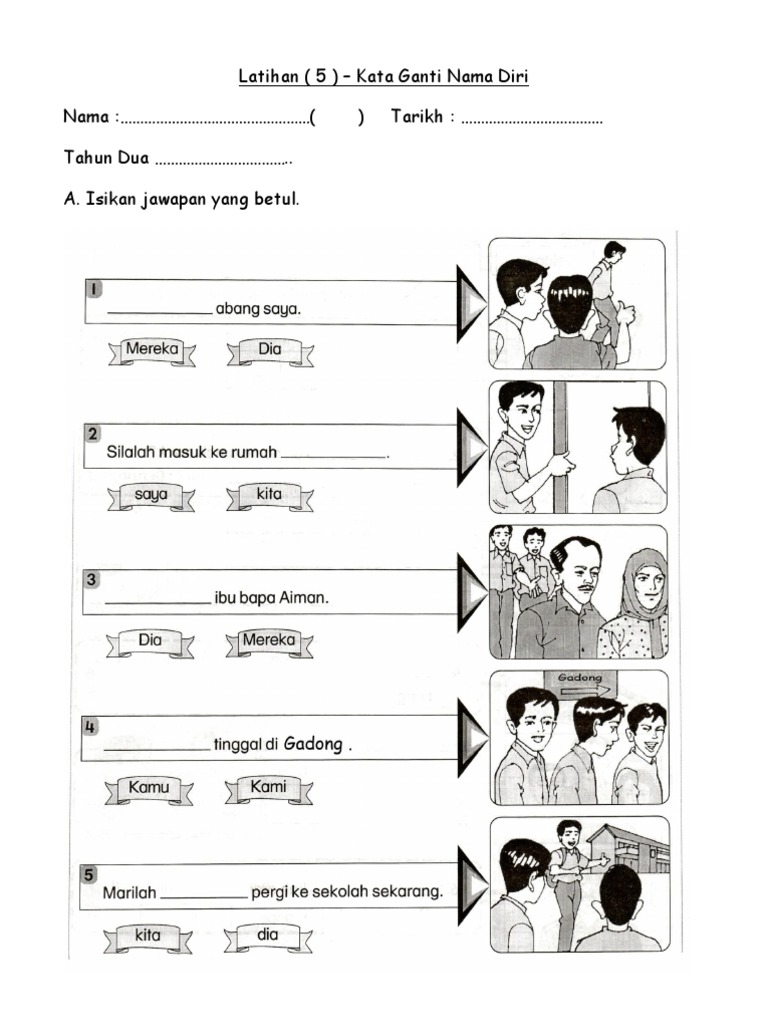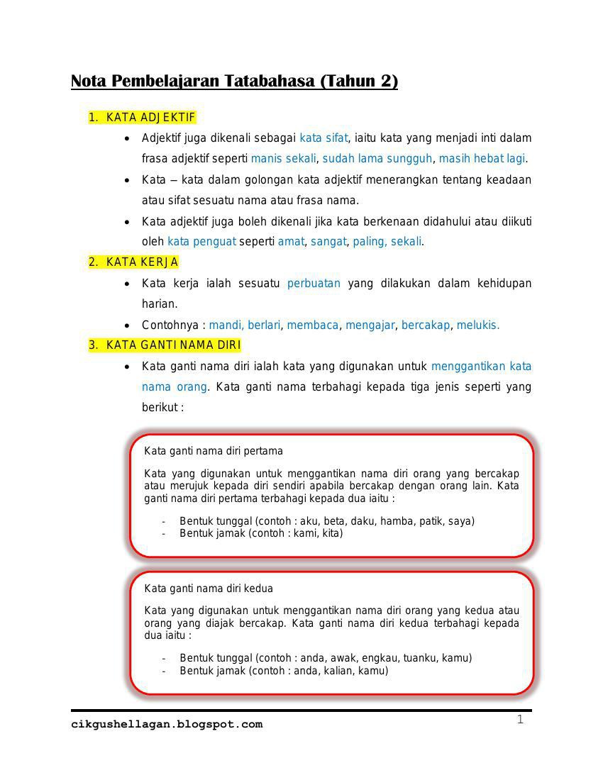 Kata kerja tahun 2 by valarmathi66. Dalam penyebutannya kat ganti juga dikenal dengan sebutan pronomina. Saya, aku, hamba, kami, beta, patik, kita. Dalam tatabahasa bahasa melayu, kata ganti diri ialah kata yang digunakan untuk menggantikan kata nama orang. Kata ganti nama pertanyaan ditambah kah dan tanda soal.