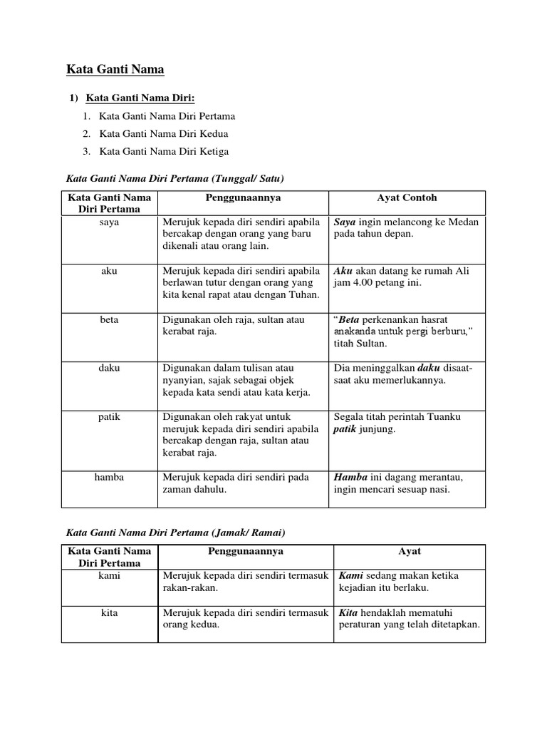 Kata ganti ini boleh dipecahkan kepada dua bentuk, iaitu bentuk tunggal dan bentuk jamak seperti berikut 2. Kata ganti nama diri pertama. Saya—digunakan apabila bercakap dengan seseorang yang baru dikenali atau dalam suasana rasmi. Kata ganti nama by aszse3773. Kata ganti biasanya terletak diposisi subjek & objek kata ganti orang adalah kata ganti yang digunakan untuk menggantikan posisi orang dalam kata ganti orang pertama tunggal merupakan kata ganti untuk penulis yang terlibat sebagai pelaku utama.