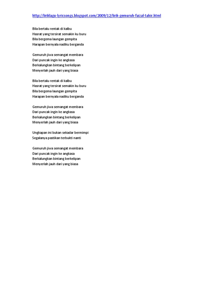 E bila bergema laungan gempita. A b hasrat yang tersirat semakin ku buru. ★ lagump3downloads.com on lagump3downloads.com we do not stay all the mp3 files as. Gemuruh jiwa semangat membara dari puncak ingin ke angkasa berkalungkan bintang berkelipan menyerlah jauh dari yang biasa. Gemuruh faizal tahir lirik lagu tanpa vokal mp3 & mp4.