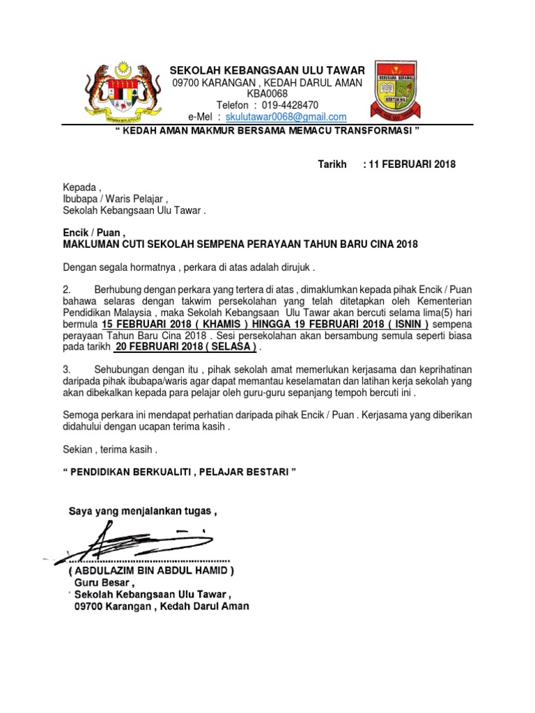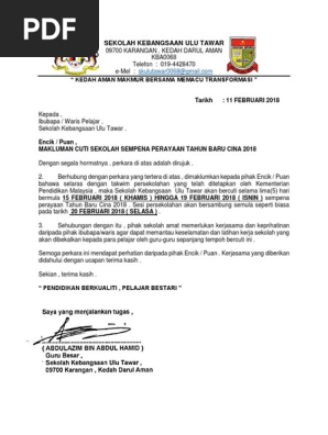 Cuti sempena perayaan 2021 ini merujuk kepada takwim persekolahan 2021 serta tertakhluk kepada negeri penempatan penjawat dan pelajar. Sumber pendidikan > semasa > takwim cuti persekolahan sempena perayaan 2019. 9 hari cuti sekolah sempena perayaan hari raya tahun baru via www.bumigemilang.com. Sekolah akan bercuti selama seminggu bermula 9hb sehingga 17hb februari 2013. Sekolah akan dibuka semula pada selasa, 4 ogos 2020. Semua sekolah hendaklah mematuhi peruntukan cuti tambahan oleh kementerian pendidikan malaysia sempena perayaan utama bagi sambutan semoga perincian cuti sekolah dan tarikh perayaan yang dimaklumkan ini dapat memberi panduan kepada semua untuk merancang aktiviti. Ini adalah surat siaran dimana cuti sekolah sempena hari raya mulai 17 ogos 2012 bersamaan dengan hari jumaat telah dikeluarkan oleh cuti ini diberikan awal sehari bagi memudahkan semua umat islam yang menyambut aidilfitri dan membuat persiapan awal dimusim perayaan ini. 5037 hits muat turun divider cuti perayaan dan cuti sekolah 2018 untuk ditampal di dalam buku rph semoga bermanfaat terima kasih kepada yang berkongsi sumber fb sazali bin mohamed mokhtarudin. Carian maklumat takwim cuti persekolahan sempena perayaan utama di malaysia untuk tahun 2021 yang dikeluarkan secara rasmi oleh kpm. Sekolah kumpulan b perlis, pulau pinang, perak, selangor, negeri sembilan, melaka, pahang, wilayah persekutuan kl, putrajaya. Cuti sekolah 2021 kalendar takwim penggal persekolahan. Cuti sempena nuzul al quran sk bukit tunggal via skbukittunggaltba3043.blogspot.com. Semoga lebih banyak kejayaan dan pencapaian.